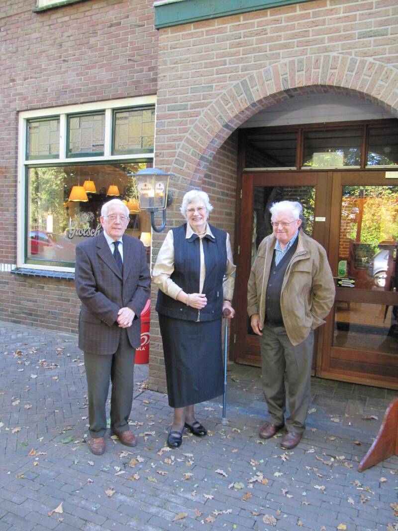 Boekpresentatie vlnr Henk Krosenbrink, Riek Beskers en Willem Wilterdink